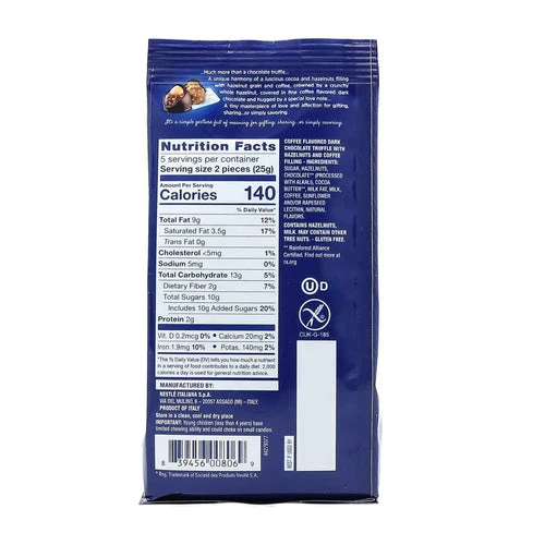 Experience the alluring enchantment of Baci Coffee Dark Chocolate Truffles from Perugina! A flavor journey of coffee essence and sumptuous dark chocolate, finished with a crunchy hazelnut crown and secret Love Note inside a starry wrapper. Made with Nestle Cocoa Plan and UTZ certified chocolate, this gluten-free, kosher, and non-GMO certified delicacy is sure to elevate your offerings and wow your clientele.