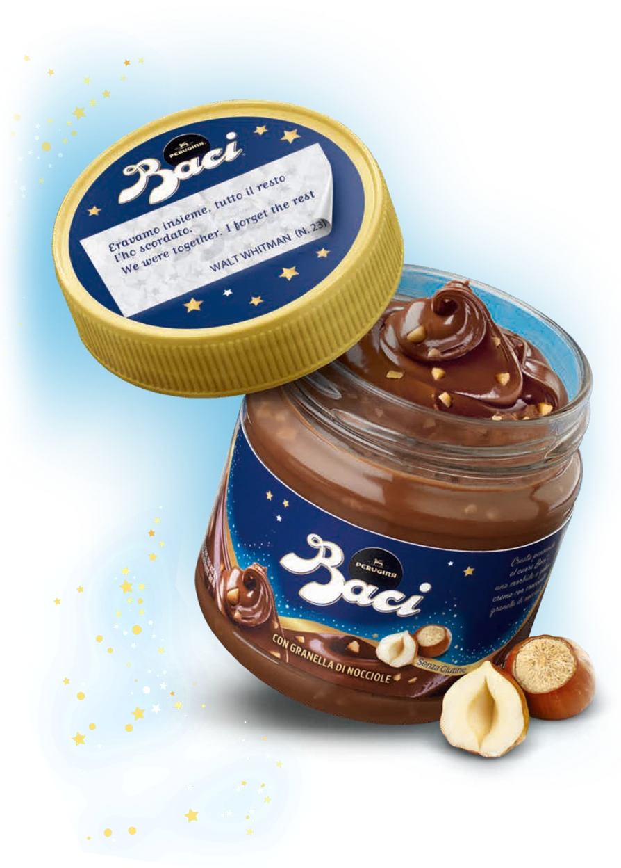 Created thinking of the unmistakable heart of Baci ® Perugina ® , the new spreadable cream is born that will make you fall in love at the first taste. Savor the intense pleasure given by a gianduia cream combined with chopped hazelnuts : an experience of unforgettable taste and textures.