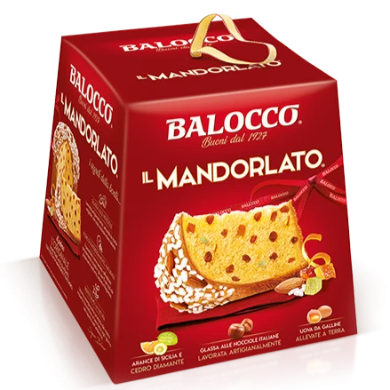 Balocco Mandorlato is a sweet, naturally leavened baked product, free from genetically modified ingredients. Made following a traditional Balocco recipe, it is the first panettone to be made with almonds and sugar.