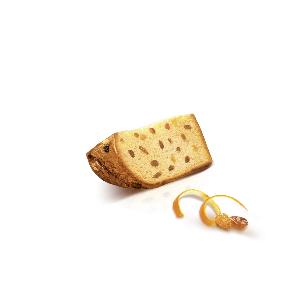 A product made according to the typical receipt: made by natural leavening for a dough that keeps soft and fragrant over time, with fragrant candied fruits and raisins.