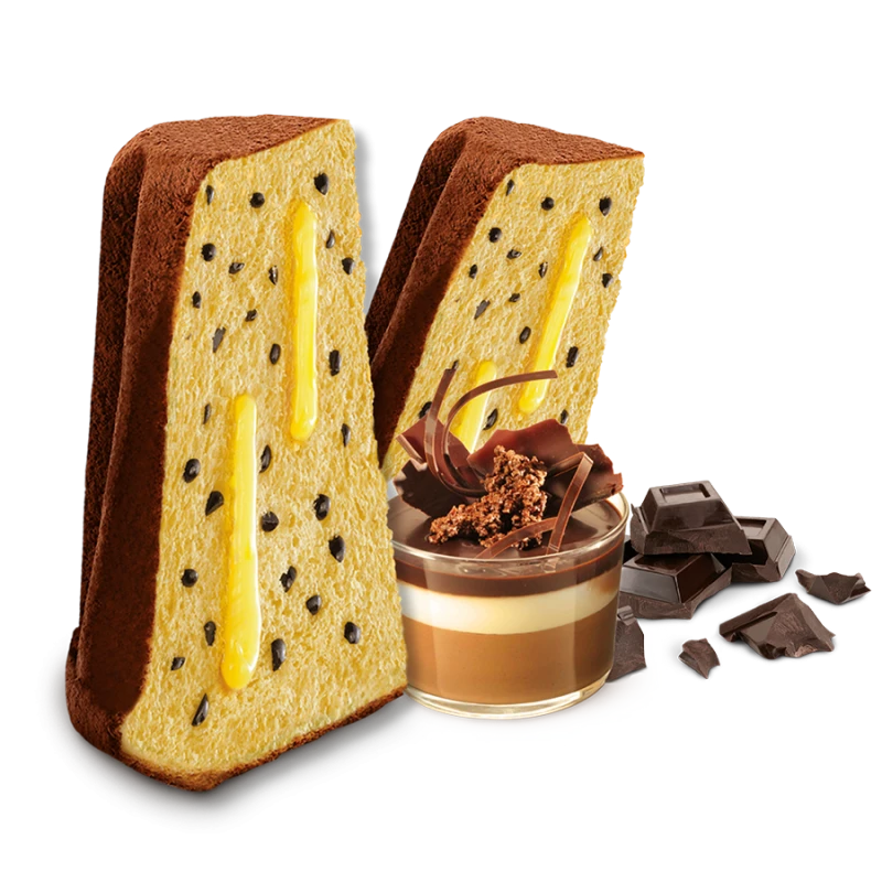 Soft naturally leavened Pandoro, filled with delicate Bavarian cream and lots of dark chocolate drops, to be sprinkled with cocoa powder, for the final touch.