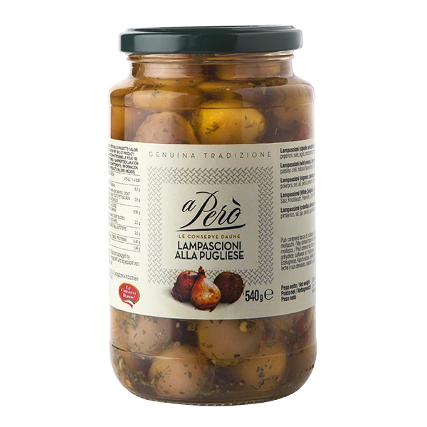Ingredients: lampascioni (cipolle selvatiche) 60%, olio di semi di girasole, aceto di vino bianco, peperoni, sale, aglio, prezzemolo, peperoncino, aromi naturali. Correttore di acidità: E330. Antiossidante: E300.
