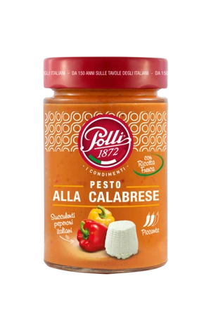 Polli’s PESTO ALLA CALABRESE stems from a long-standing, passionate, and traditional Italian cuisine. Succulent Italian peppers, picked, washed, and immediately seasoned with extra virgin olive oil, chili pepper, and fresh ricotta based on the best of Calabrian tradition!