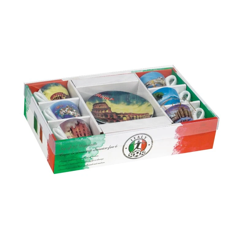 Porcelain Espresso Cup with the Cities of Italy and saucer set featuring the best. The beauty and architecture are captured beautifully in each individual-designed cup with matching saucers. Made to stand up to everyday use. Each cup and saucer is made in bright white porcelain to match any decorating. Heavy porcelain keeps coffee warmer longer. Each saucer is 5 inches in diameter. Complete set of 6 durable porcelain. Dishwasher safe.
