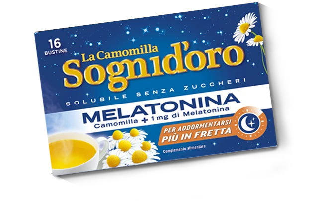 The unmistakable and generous taste of Sognid’oro chamomile is combined with 1mg of Melatonin, a substance naturally present in our body and which contributes to reducing the time required to fall asleep, to lull you to sleep in a delightful way. Soluble without sugar.