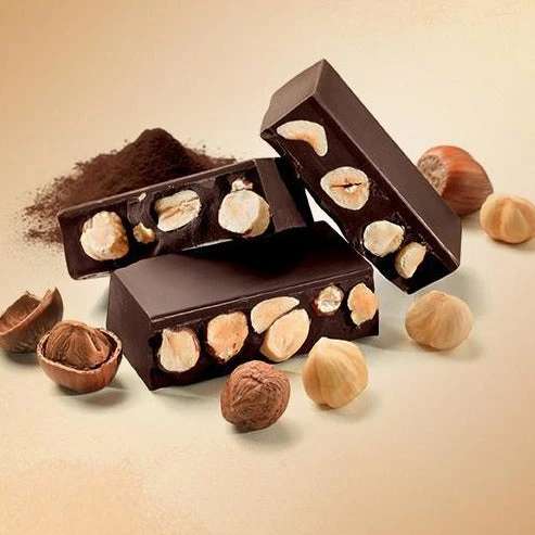 Dark chocolate nougat. Crunchy and shiny, with fragrant hazelnuts immersed in a refined fondant: immediately the hint of bitter fondant, then the fragrant and crunchy hazelnuts and, finally, a slight hint of fine vanilla.