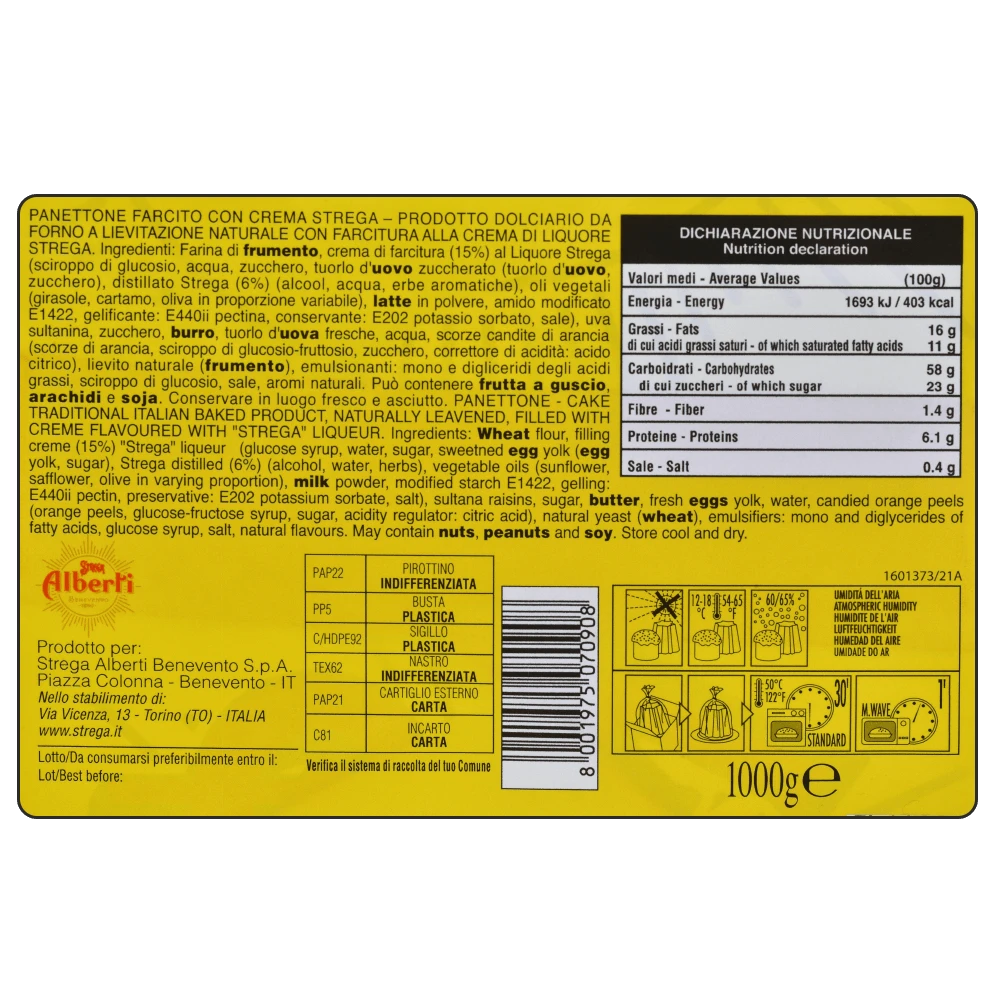 Soft wheat flour Raisins sultanas Filling cream with Strega liqueur 12% (sugar, rehydrated low-fat milk powder, powdered egg yolk, ethyl alcohol, thickener: pectin, preservative: potassium sorbate, flavorings) Sugar Butter Yolk egg Candied orange peel (orange peel, glucose-fructose syrup, sugar) Natural yeast Monodiglycerides of dietary fatty acids Salt Natural flavors Allergens: Contains Gluten It may contain Nuts – Peanuts – Soy